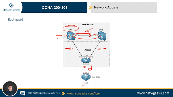 Root Guard es una característica que evita que el puerto se convierta en Root Port. Esto significa que te protege por ejemplo cuando alguien introduce un switch no autorizado en tus puertos de acceso, y este switch quiere convertirse en Root Bridge.