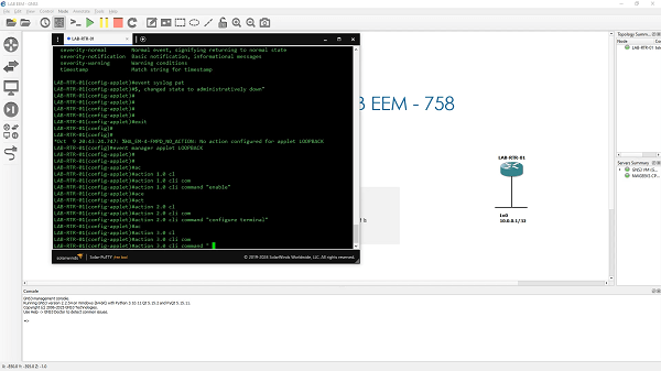 Este es tal vez uno de los laboratorios más simples de realizar si es que han seguido las clases teóricas del curso ENCOR, ya que exactamente lo que nos piden acá, ya lo realizamos como demostración en la clase. Acá trabajaremos con un solo router que cuenta con múltiples interfaces, y nuestra misión será crear un applet EEM capaz de automatizar tareas sobre las interfaces del dispositivo. Para lograrlo necesitaremos comprender: