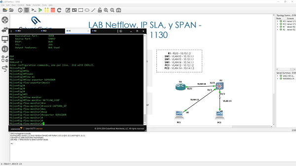 En este segundo ejercicio, nuevamente configuraremos una operación de IP SLA que ya vimos y estudiamos en las clases del curso ENCOR. Después, continuaremos con NetFlow flexible, esta vez centrándonos en configuraciones de Flow Monitor, y finalizaremos con configuraciones de SPAN donde capturamos el tráfico de una VLAN.